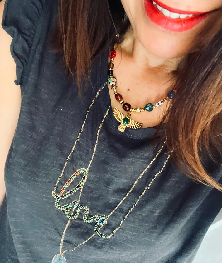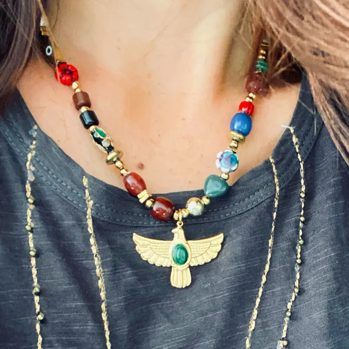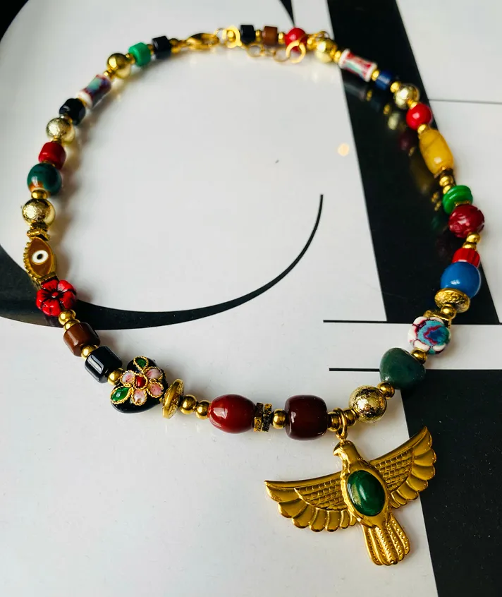 Collier mélange de perles colorées et dorées avec pendentif Aigle